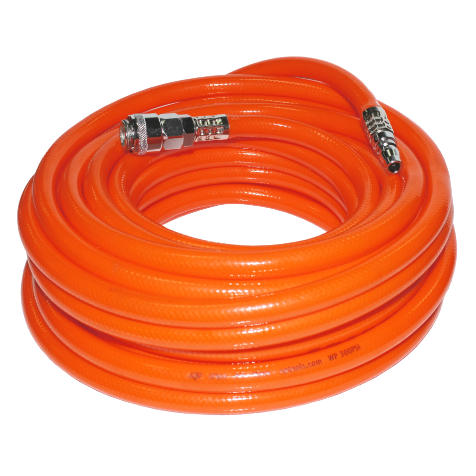 Introducing our premium SP fitted air hoses! These hoses are made from a special hybrid polymer that offers exceptional flexibility in all weather conditions, even in freezing temperatures. They are built to withstand the tough shop environment with a durable abrasion-resistant outer cover.